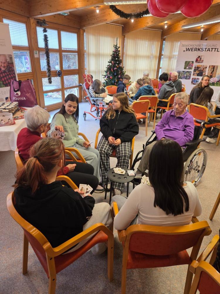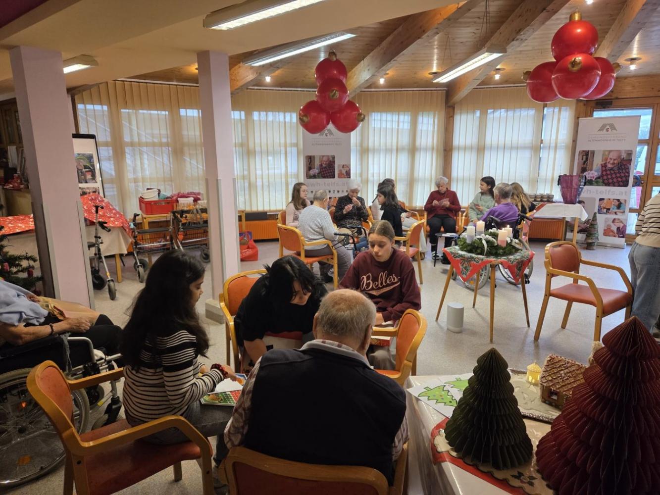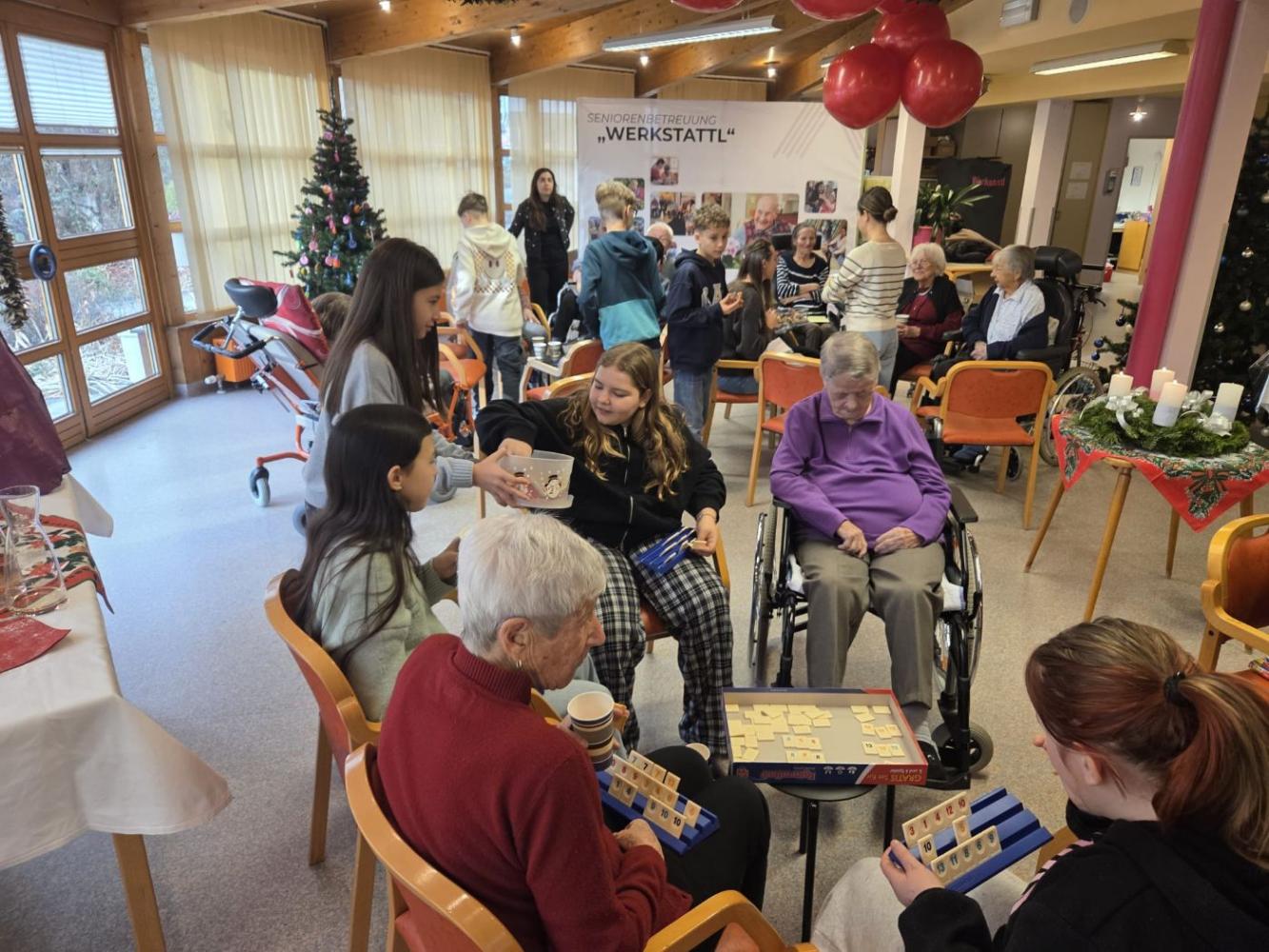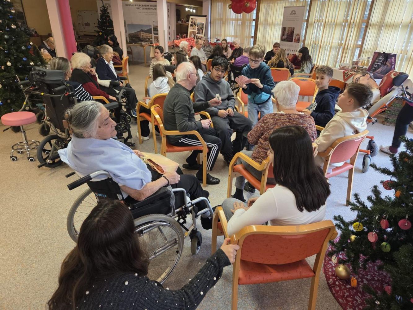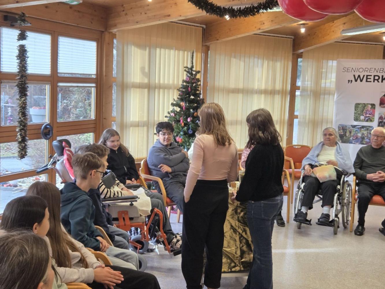 In der Vorweihnachtszeit machte sich die Klasse 2f auf einen ganz besonderen Weg: Ziel war das Altersheim Wiesenweg, um gemeinsam mit den Bewohnerinnen und Bewohnern einen festlichen Vormittag zu verbringen. Es wurde viel gelacht, gespielt und gesungen – alte und neue Weihnachtslieder sorgten für die richtige Stimmung. Natürlich durften auch die selbstgebackenen Kekse nicht fehlen, die von den Schülern verteilt wurden.